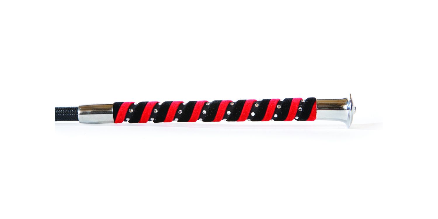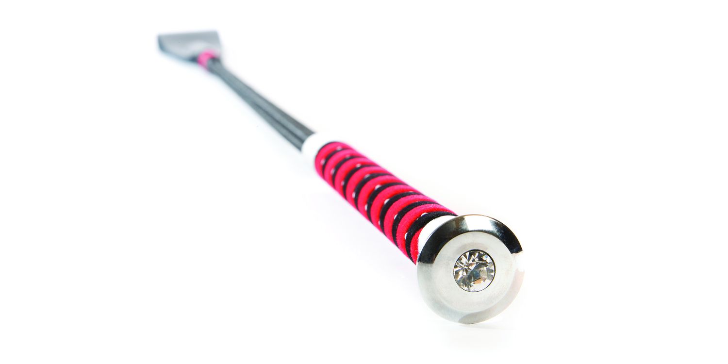 A beautifully braided whip with a closed leather keeper. Featuring diamante encrusted handle and metal cap with large diamante stone, you can't get more sparkle!