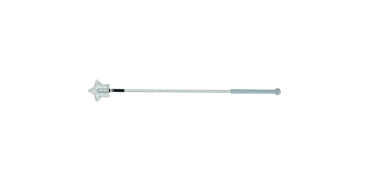 Add some sparkle to your riding outfit with this fun design! Glitter covers the whole whip, topped with a silver handle. Star end design.