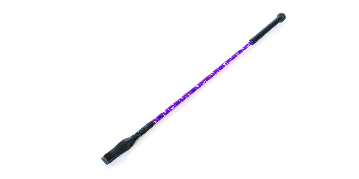 A riding whip featuring a silver spiral shaft and horse print design in a range of colours.