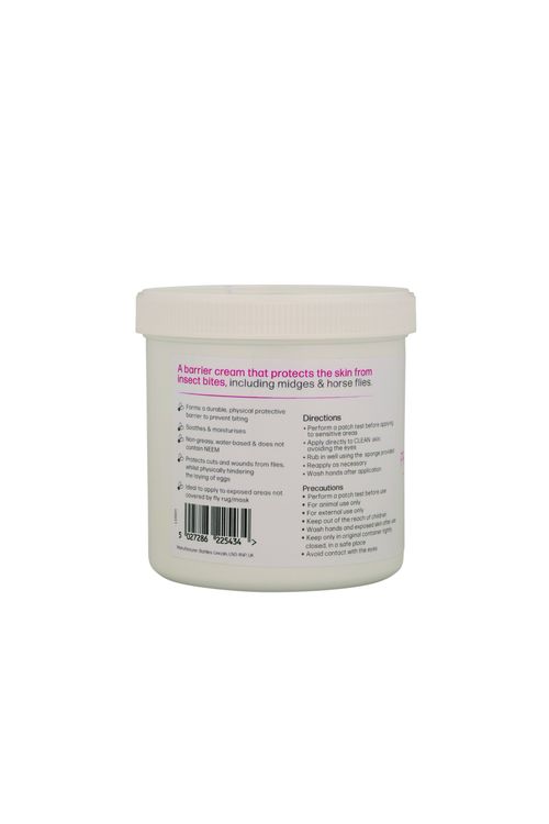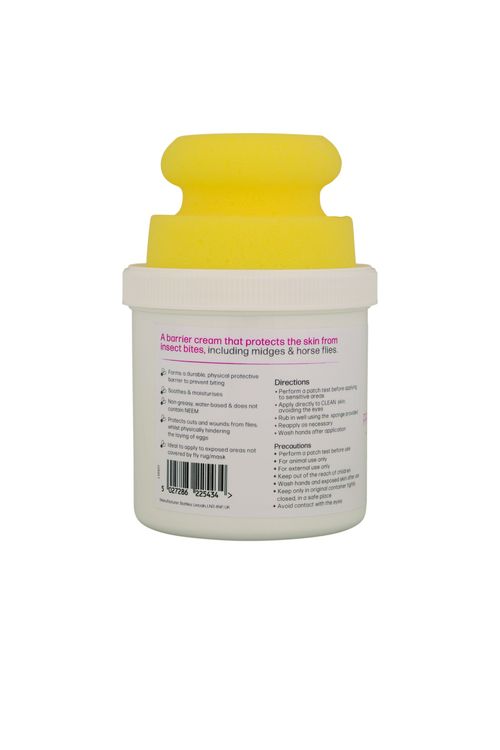 A barrier cream which protects the skin from insect bites, including midges and horse flies. Forms a durable, physical protective barrier to prevent biting whilst soothing and moisturising. This non-greasy, water-based and does not contain NEEM and protects cuts and wounds from flies, whilst physically hindering the laying of eggs. Ideal to apply to exposed areas not covered by fly rug/mask. Comes with FREE Circular Sponge.