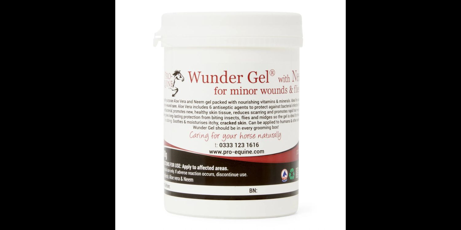 Wunder Gel™ is first aid in a tub – plus a very effective fly gel! A multi-purpose Aloe Vera and Neem gel packed with nourishing vitamins and minerals for minor wound care. Neem is antibacterial and antifungal, promotes new, healthy skin tissue, reduces scarring and promotes rapid hair re-growth. High quality Aloe Vera gel has antiseptic agents, as well as being a wonderful skin conditioner. Wunder Gel™ gives long-lasting protection from biting insects, flies and midges, so is great for itchy horses/ponies who rub their manes and tails. Wunder Gel™ soothes and moisturises itchy, cracked skin and is easy to apply to those sensitive, scabby areas such as underbelly, heels and white socks. Wonderfully versatile Wunder Gel™ should be in every grooming box/tackroom!