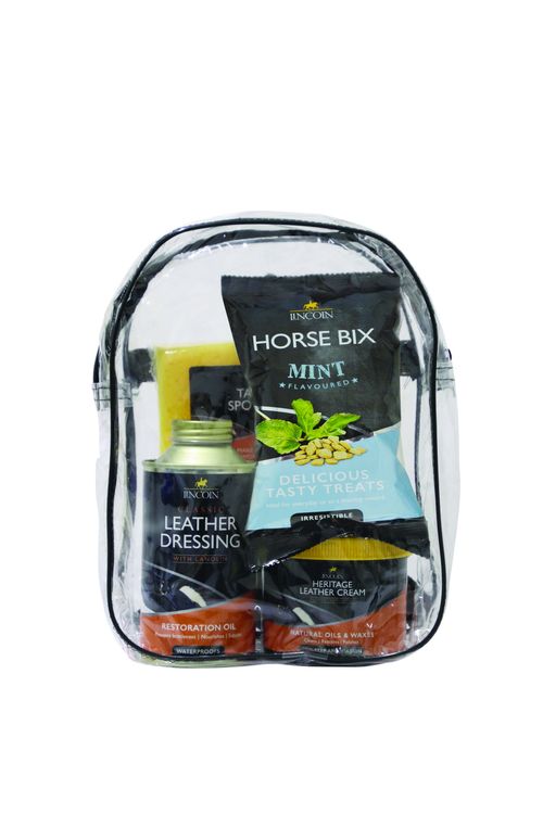 A pack to clean and maintain leather tack, keeping it in tip top condition. Packaged in a convenient PVC rucksack it contains the award-winning Lincoln Heritage Leather Cream 400g, Lincoln Classic Leather Dressing 1 x 500ml, Large Lincoln Tack Sponge, Horse Bix 150g.