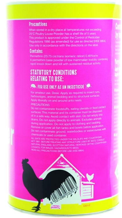 A ready-to-use insecticidal powder for use in animal houses. Containing Permethrin it will be effective against mites lice and fleas. For application to bedding and housing used by infested birds. Rapid kill with sustained residual activity. Use in conjunction with Red Mite Powder. This product is not intended for use directly onto the animal. Sprinkle pack. HSE 10252.