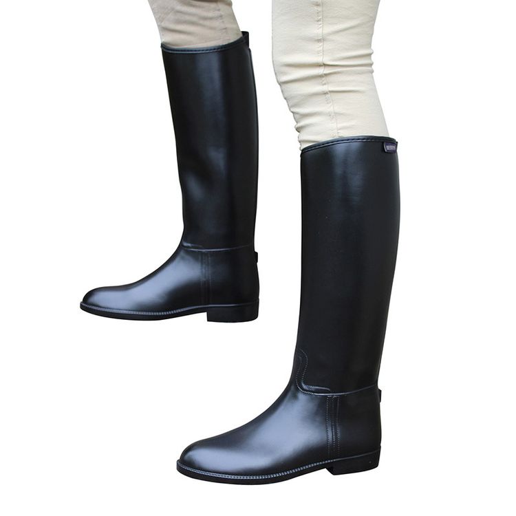 Smart yet durable synthetic tall riding boot featuring breathable cushion lining, rear spurs and elasticated top offering rider comfort and fit. Fully waterproof with rippled sole for better grip. Available in black only.