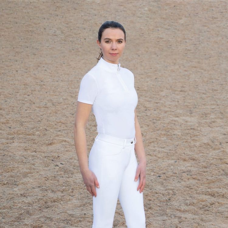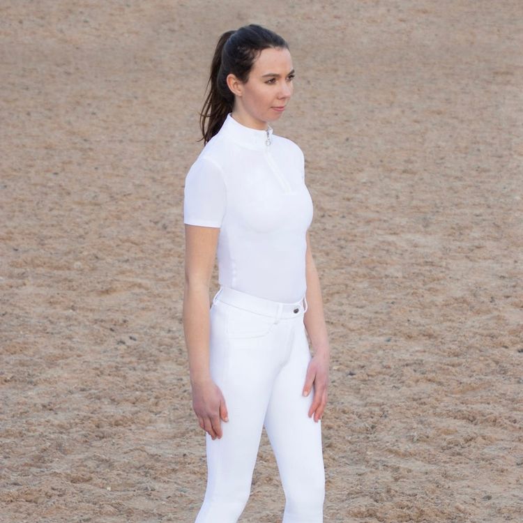 A must have addition for any serious equestrian athlete, the Ayton Show Shirt is endlessly practical and a wonderful looking competition shirt.The exceptionally buttery-soft short sleeved competition shirt sculpts perfectly for a feminine fit and is crafted from a revo-tech and antibacterial fabric that optimises moisture and sweat wicking with help from capillary action to help keep the active rider fresh and hygienic. The free stretch material that is specially crafted using a seamless design for ultimate comfort, allows for a full and comfortable range of movement. The easy-care anti-UV fabric can be machine washed at 30 degrees and dries quickly, making the shirt ideal for frequent wear.A perforated logo features on the back of the shirt, that not only gives an elegant finish, but performance is enhanced due to the additional airflow and ventilation aiding breathability.The shirt is fastened with a silver zip and hexagonal zip pull, detailed with a Coldstream blue lining. Finished with Luxury Coldstream branding including silicone logo to the sleeve and emblem to the collar.