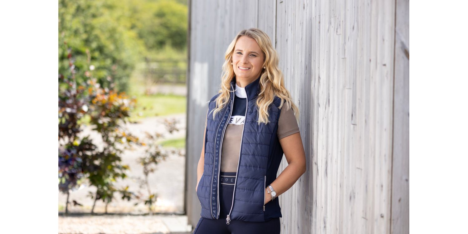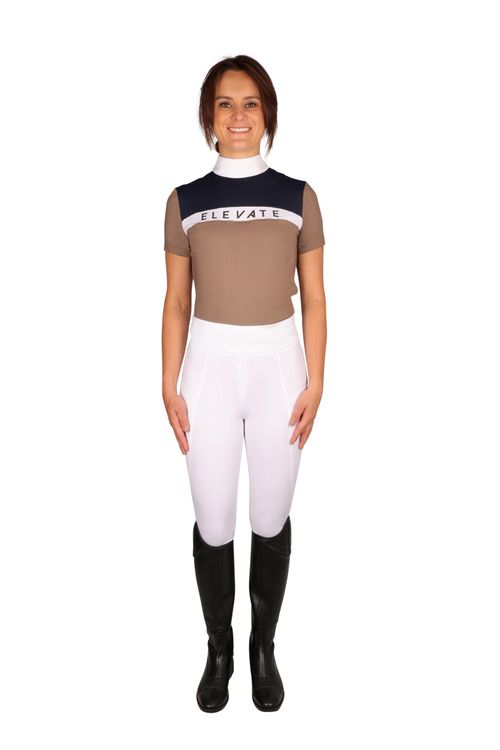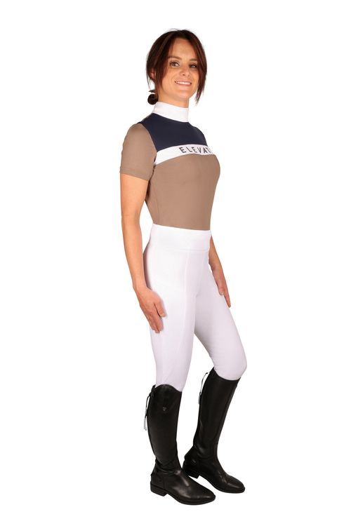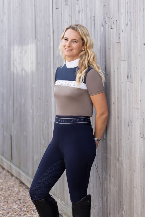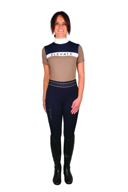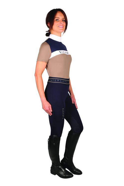 Designed for the active equestrian athlete, the navy and fossil Elevate Allure Show Shirt is perfect to wear at competitions or for training. Carefully crafted from a high-performance material with moisture wicking properties for optimum breathability and ventilation. This smart shirt is detailed with metallic foil emblem across the chest for a sparkling touch. Sculpted stitching results in a flattering silhouette, creating the perfect picture for when in the saddle. Fastened with a discrete rear zip to the neck.