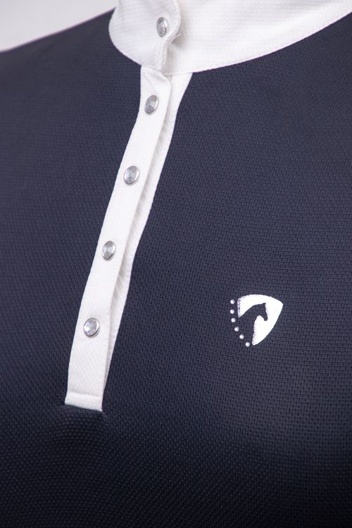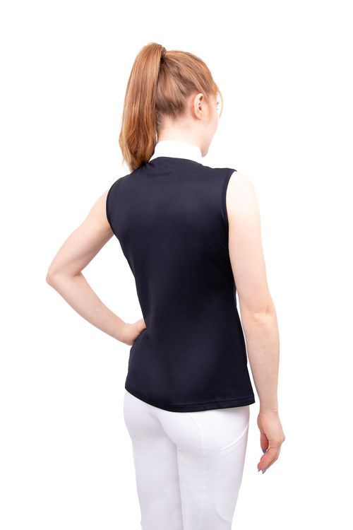 This sophisticated show shirt is beautifully designed with five crystal press studs on the neck placket and a white collar with silk trim detailing. Made with the leading performance fabric, Dri-tex, the breathable sleeveless shirt repels moisture away from the body for a quick drying and comfortable fit. The Hy Equestrian logo is embroidered in tonal stitching on the rear and a silver foil emblem features on the chest for an elegant finish.