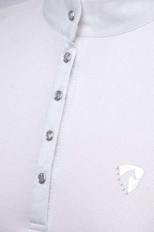 This sophisticated show shirt is beautifully designed with five crystal press studs on the neck placket and a white collar with silk trim detailing. Made with the leading performance fabric, Dri-tex, the breathable sleeveless shirt repels moisture away from the body for a quick drying and comfortable fit. The Hy Equestrian logo is embroidered in tonal stitching on the rear and a silver foil emblem features on the chest for an elegant finish.