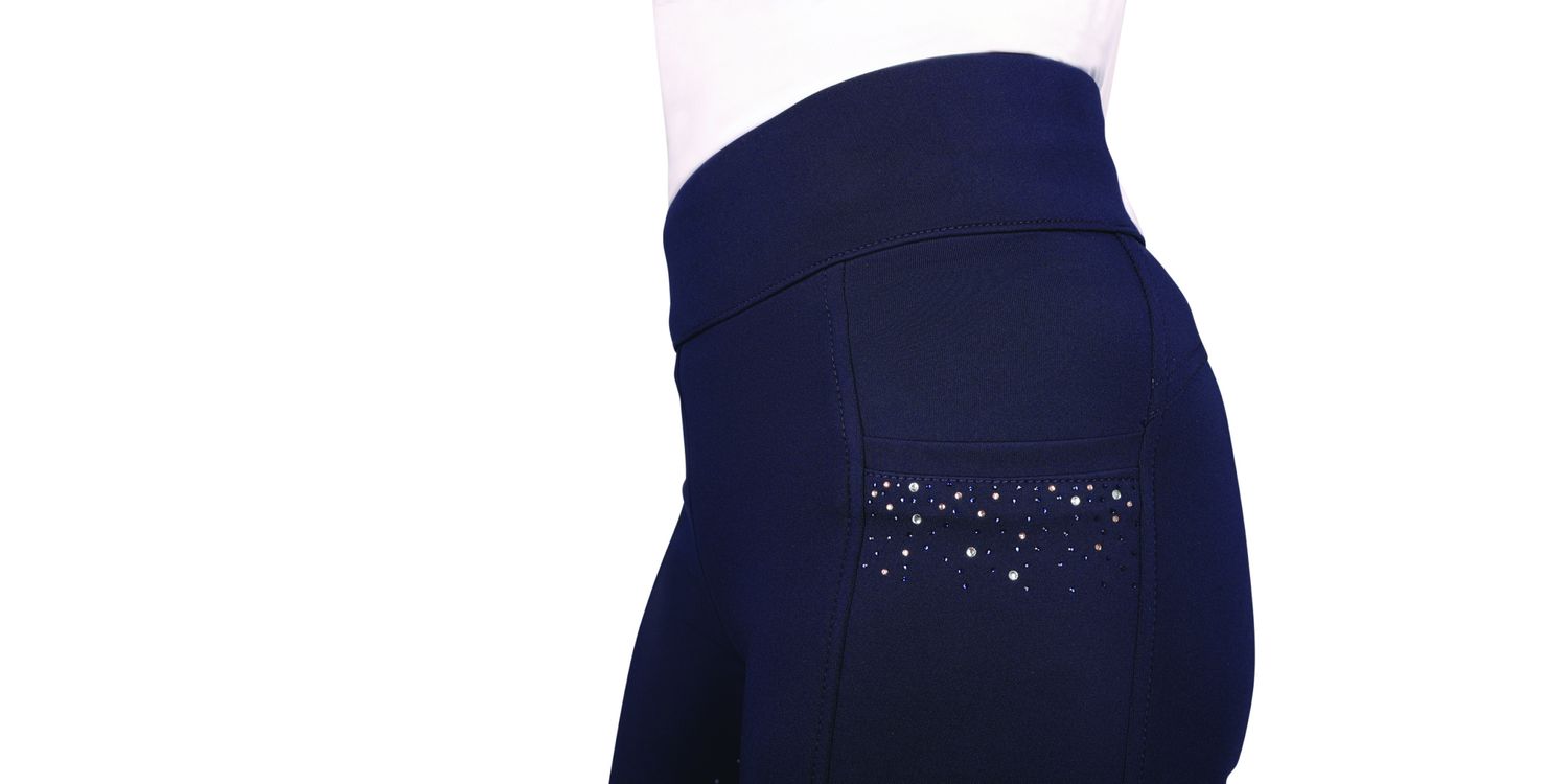 Designed using a flexible, moisture wicking fabric, these performance riding tights are smart, stylish and flattering, and the contoured stretch design allows for a full range of movement and a flattering fit. Featuring rose gold, navy and silver diamantes to pockets, these gorgeous riding tights will be a core part of your riding attire! A full silicone seat for extra grip in the saddle and no bulk stretch hem ankles for the perfect fit under long boots ensures this statement tight will help you look and feel great! These look great when paired with other items in the Roka Regal collection.