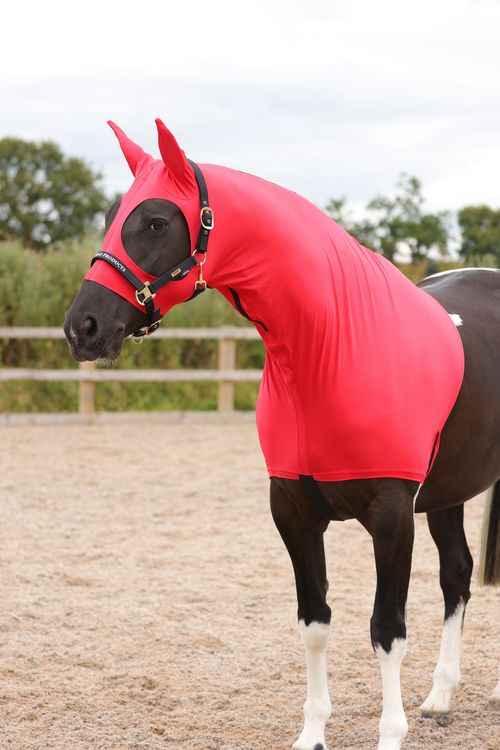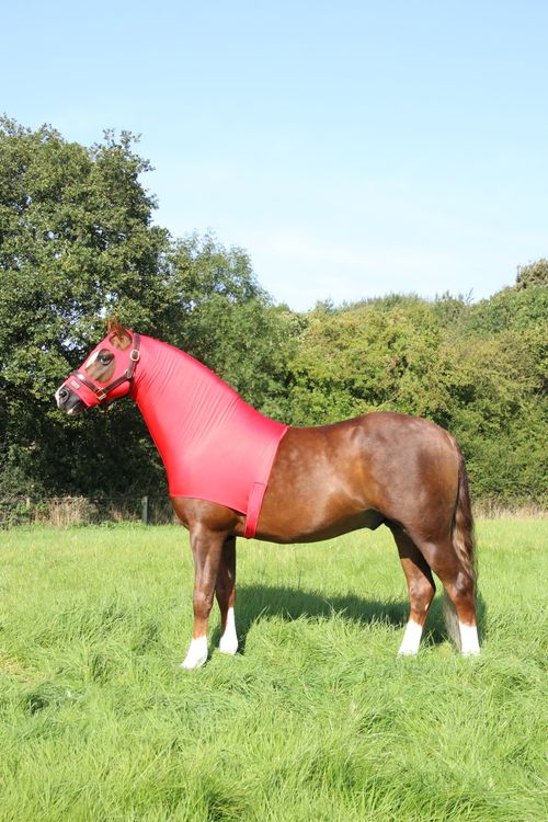 The Supreme Products Two in One is a hood and vest combined and will protect the chest area, withers and shoulder area as well as laying the coat and keeping plaits intact and pristine. It also comes with ears as standard for those who Don't want fluffy ears! This garment has a zip down the front of the neck, a strap fitted through the front legs and is secured by a girth strap, making this an excellent garment for stabling or whilst travelling. Once fitted, the excess material in the neck should be pulled above the level of the rug to ensure ease of movement. Handmade in the UK.