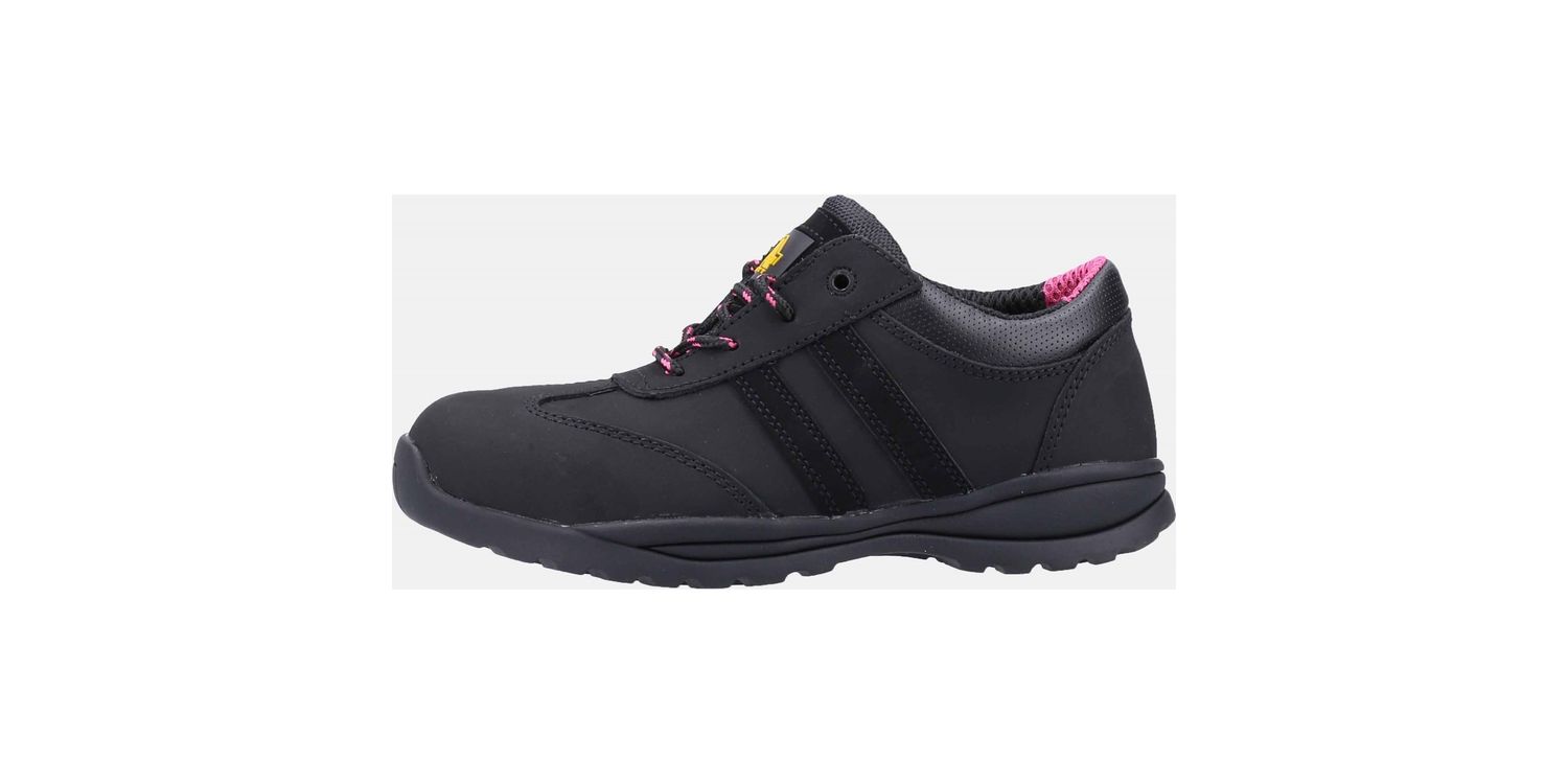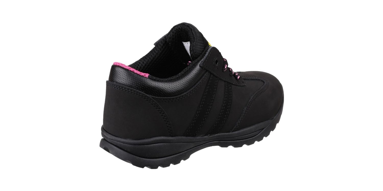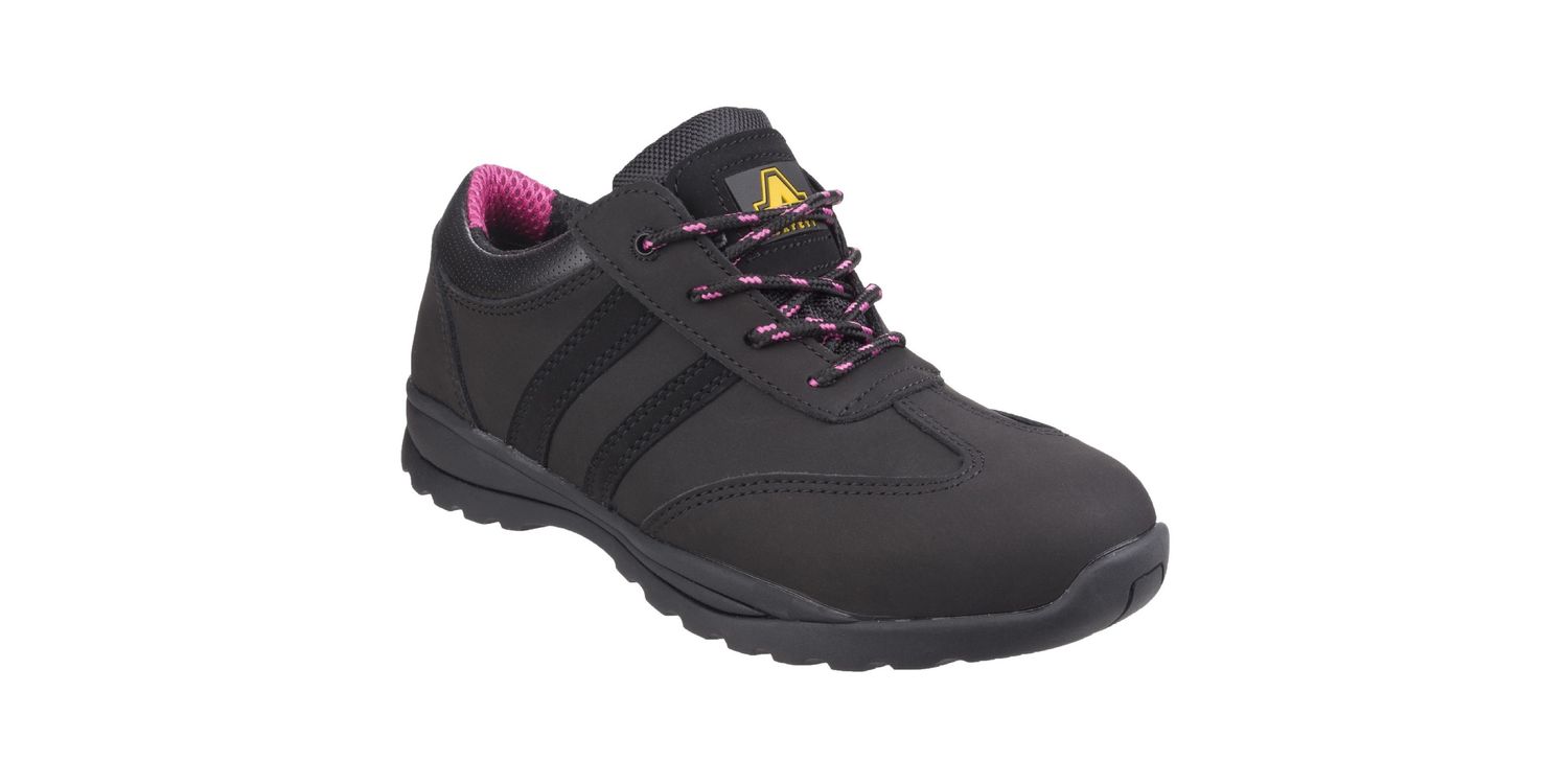 Women's modern lightweight safety trainer crafted with Nubuck Leather, PU padded collar, anti-static and durable full Rubber outsole.