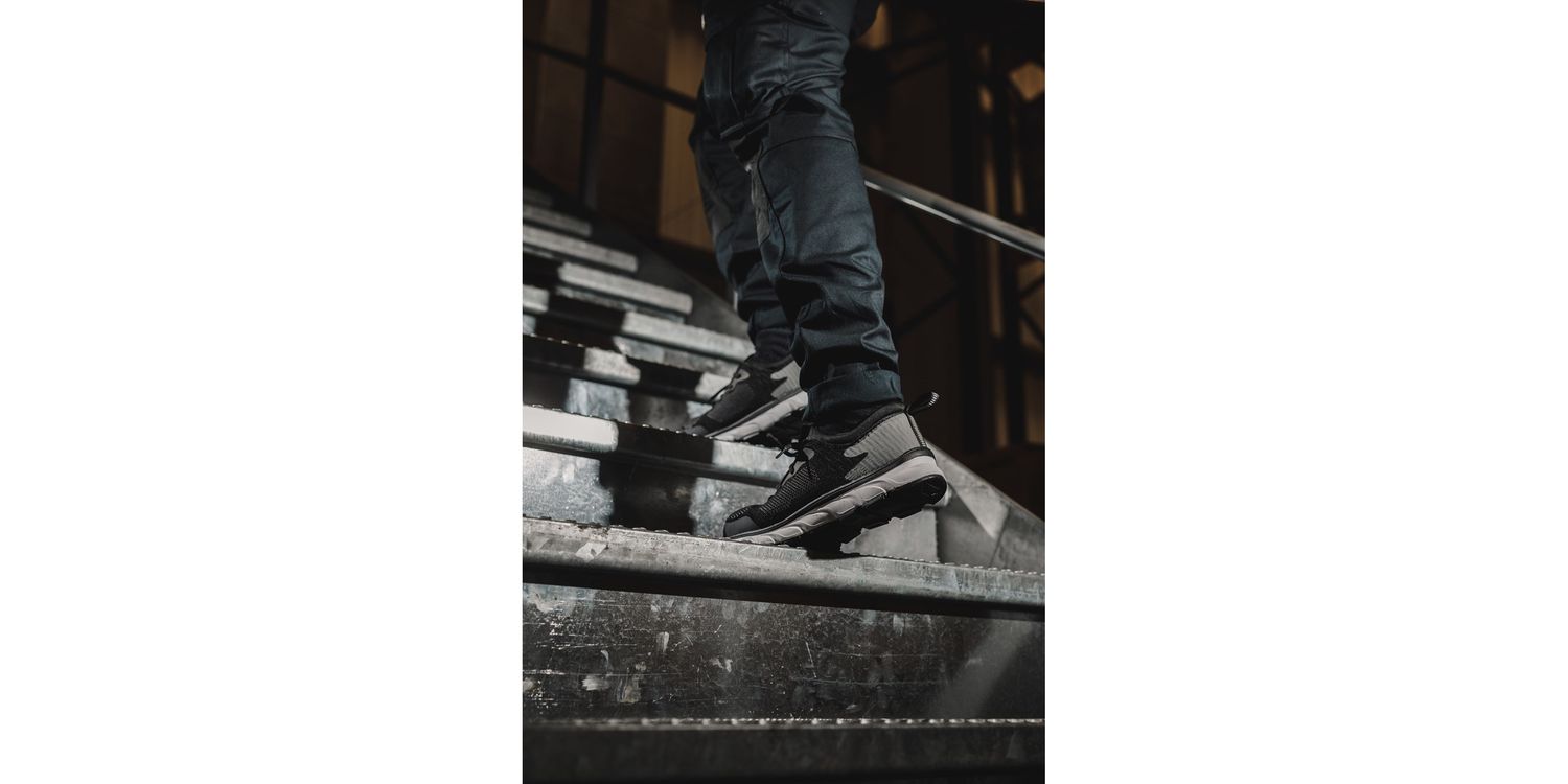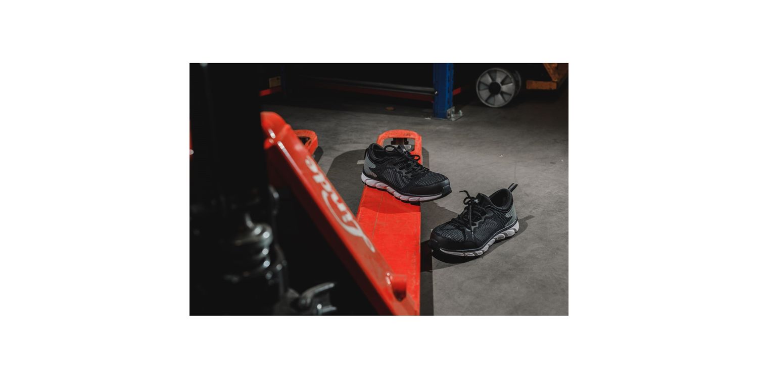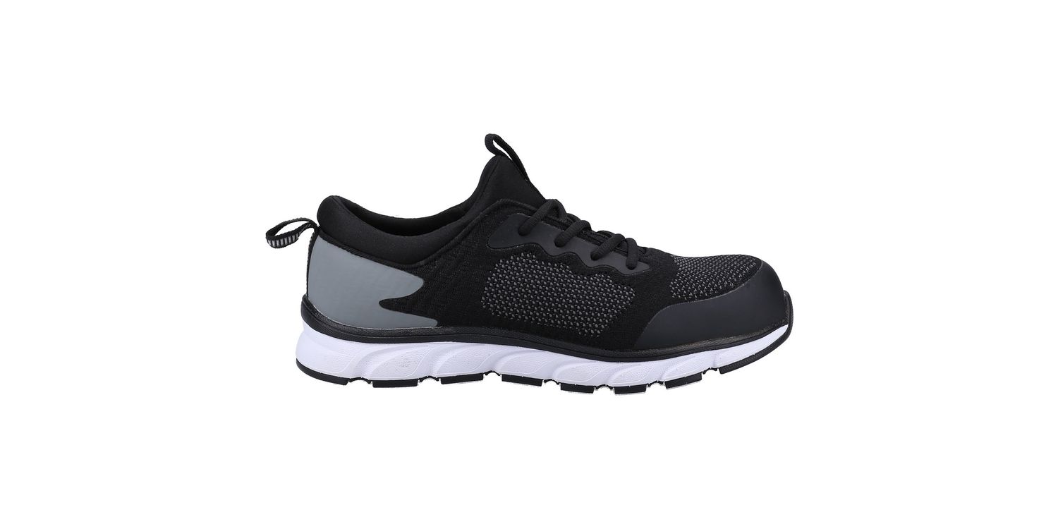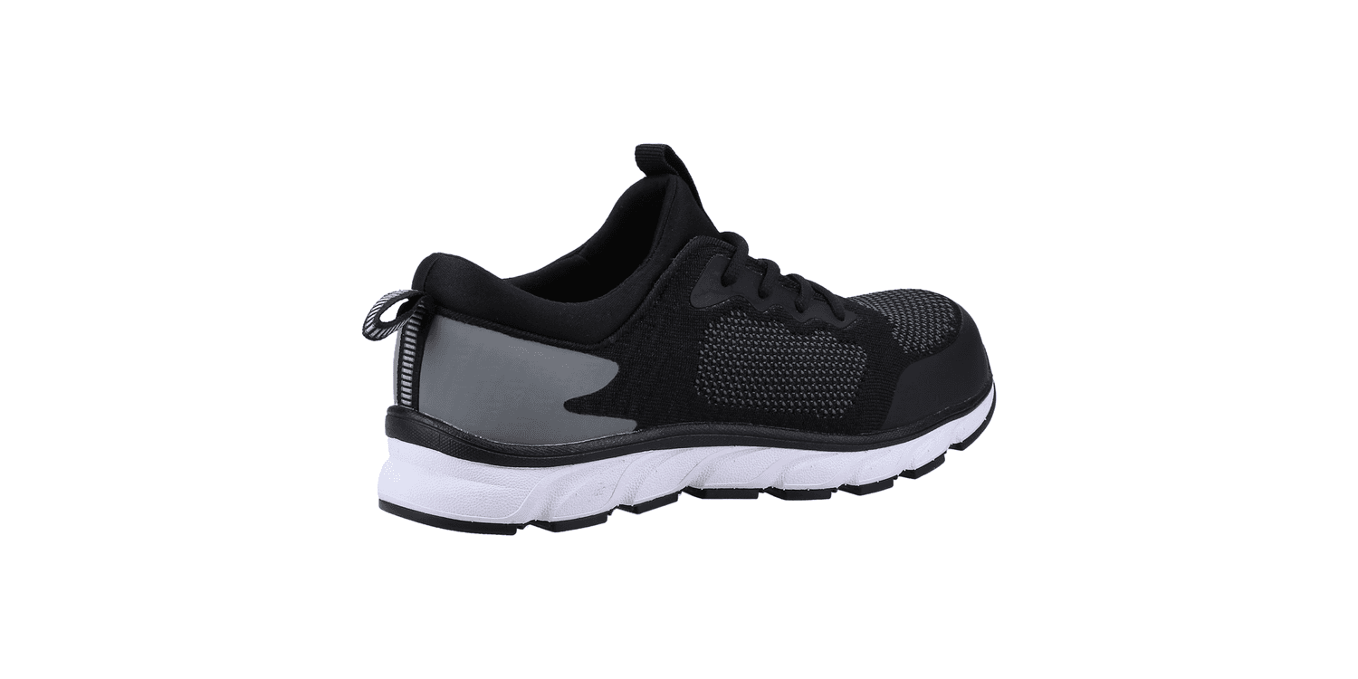 Lightweight sporty safety trainer with athletic breathable moisture wicking mesh upper and flexible traction EVA/Rubber outsole