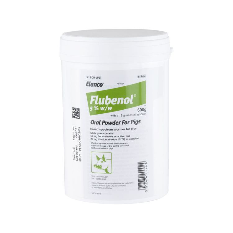A broad-spectrum anthelmintic for oral administration, active against mature and immature stages of nematodes of the gastro-intestinal tract of the pig i.e. large roundworm, red stomach worm, nodular worm and whipworm. It is an ovicidal white powder containing flubendazole 5% w/w (50mg/g) in a 600gm tub. Legal Category: POM-VPS.