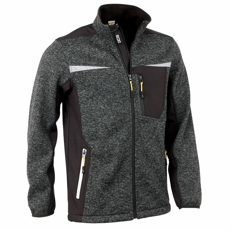Knitted fabric: 100% polyester 370gsm Softshell fabric: 100% stretch polyester 280gsm Full zip style Two side entry zipped pockets Zipped left chest pocket Elasticated taped cuffs Elasticated drawcord around bottom hem Reflective tape on chest and shoulders Reflective JCB branding