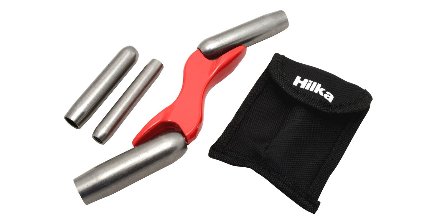 Cast iron handle with increased knuckle room. Includes 4 sizes of interchangeable barrels: 1/2", 5/8", 3/4", 7/8". Comes with storage pouch.
