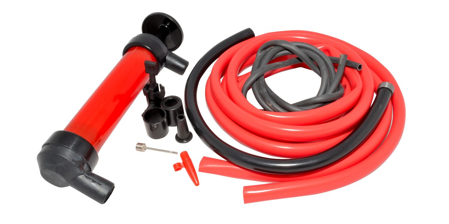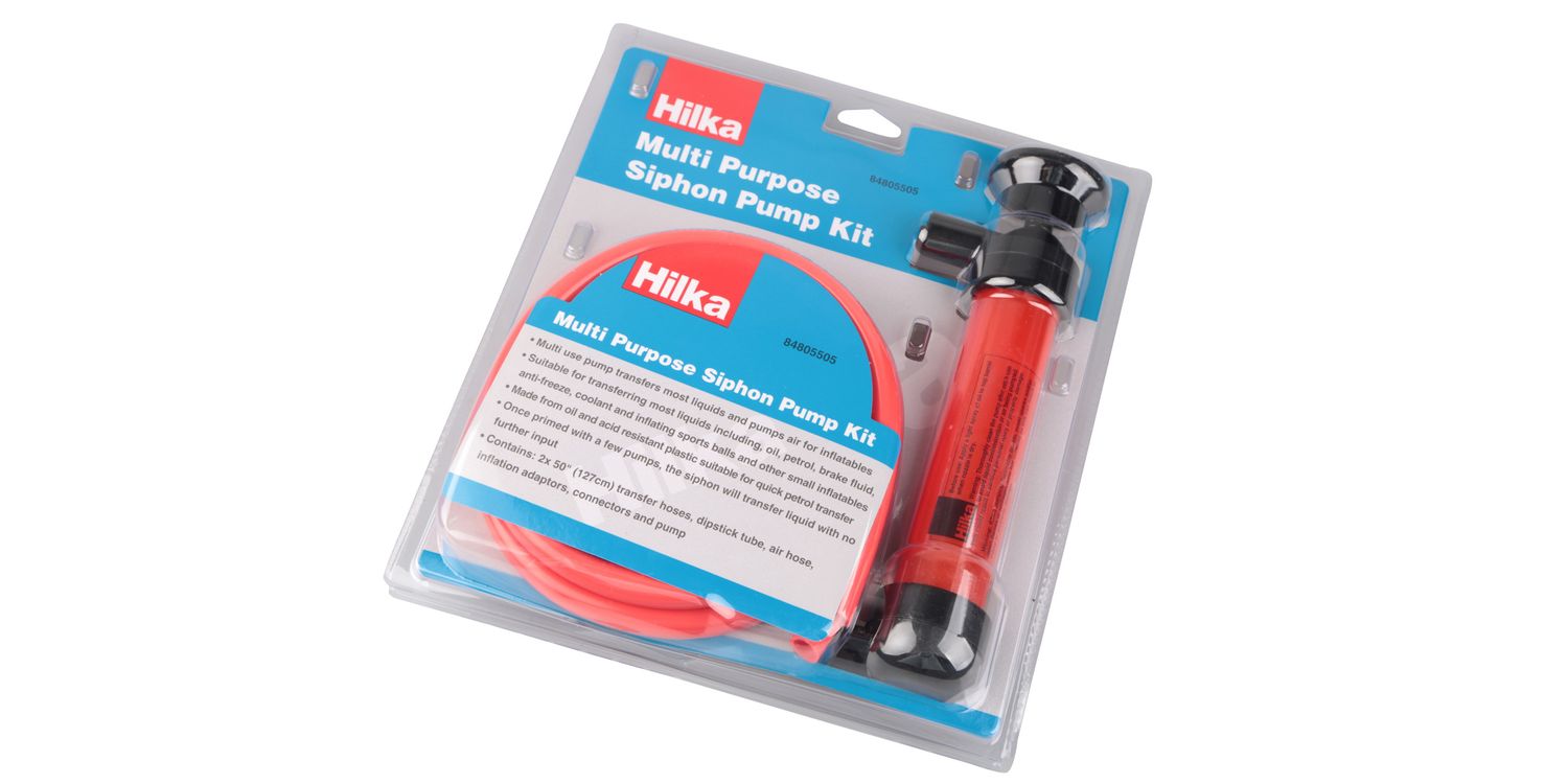 Multi use pump transfers most liquids and pumps air for inflatables. Suitable for oil, petrol, brake fluid, anti-freeze, coolant, inflating sports balls and small inflatables and transferring of most liquids. Made from oil and acid resistant plastic suitable for quick petrol transfer. Once primed with a few pumps, the siphon will transfer liquid with no further input. Contains: 2x 50" (127cm) transfer hoses, dipstick tube, air hose, inflation adaptors, connectors and pump.
