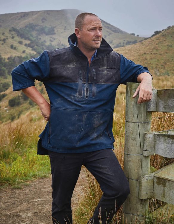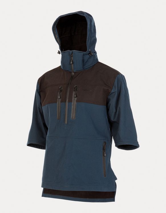 • Water-resistant softshell smock top with cropped sleeves.