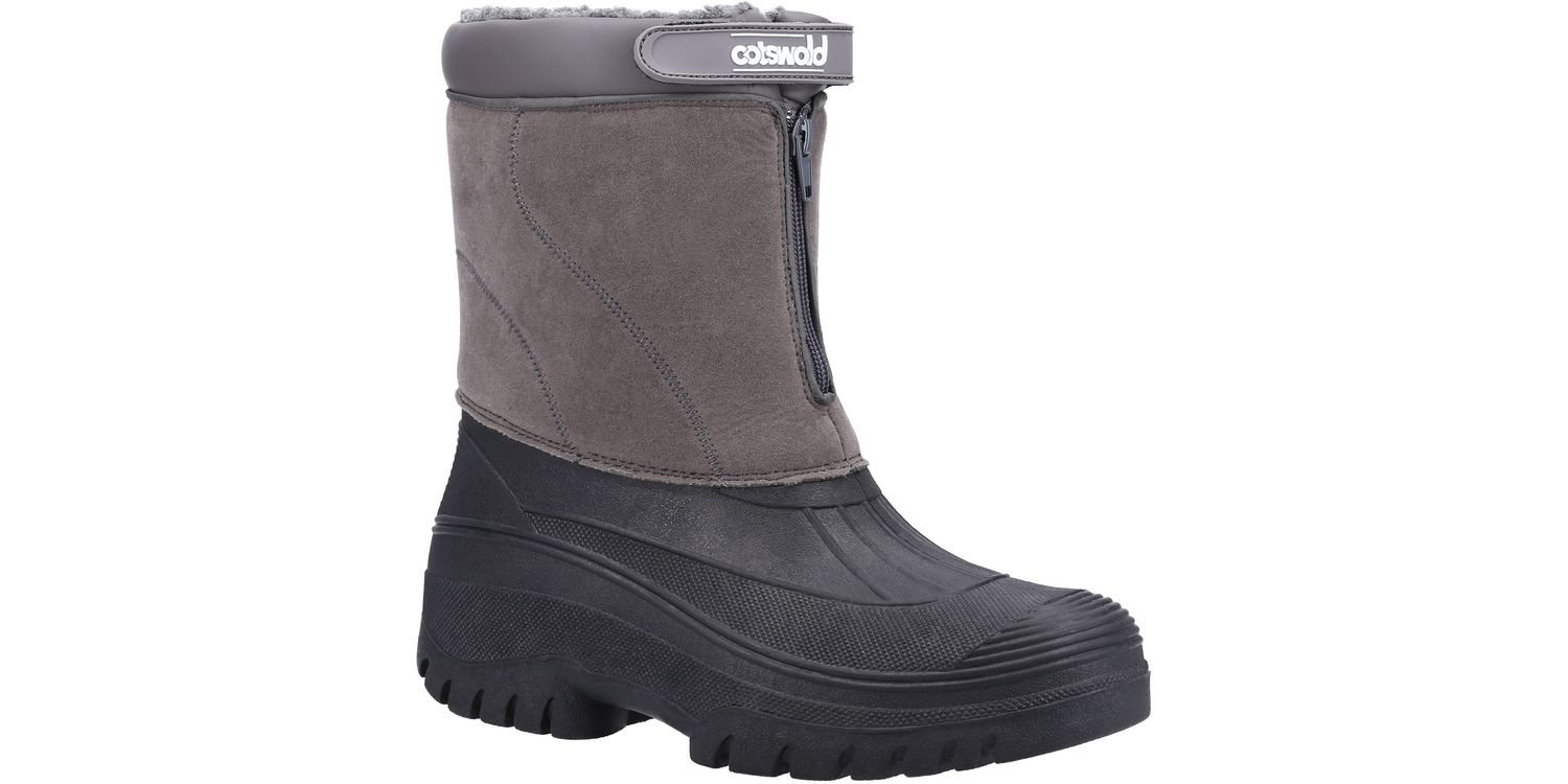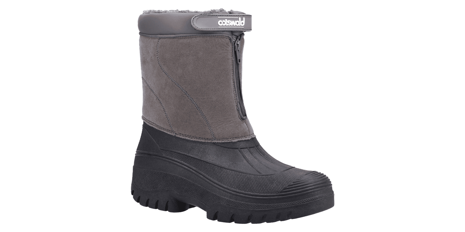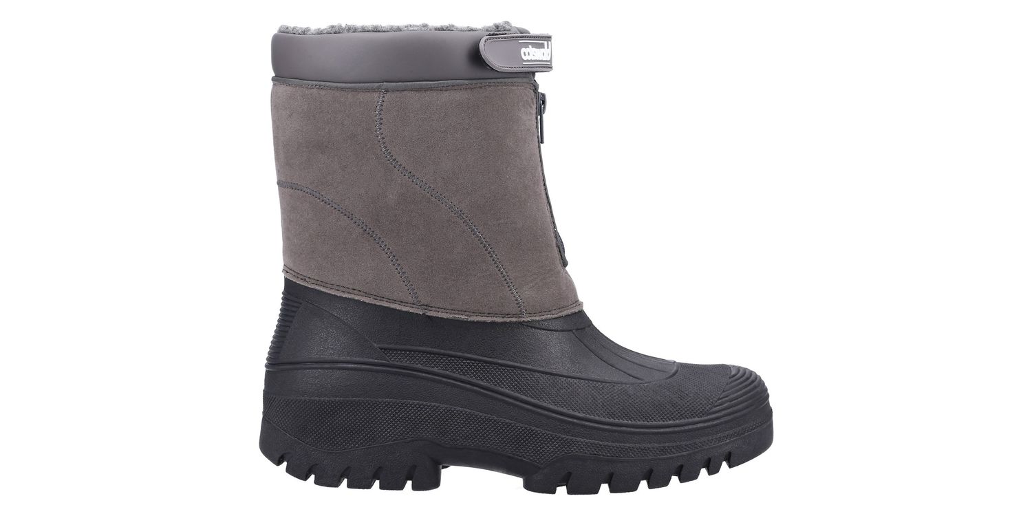 Venture hybrid weather boot from Cotswold Shoes. A stylish design with a luxury Faux Suede shaft and a fully waterproof moulded rubber galosh designed to combat the elements. Front zip entry and warm faux fur lining.
