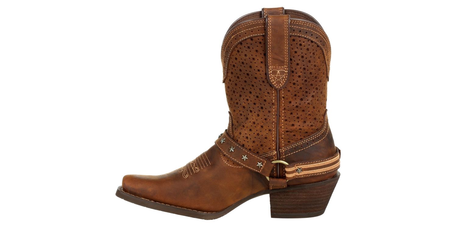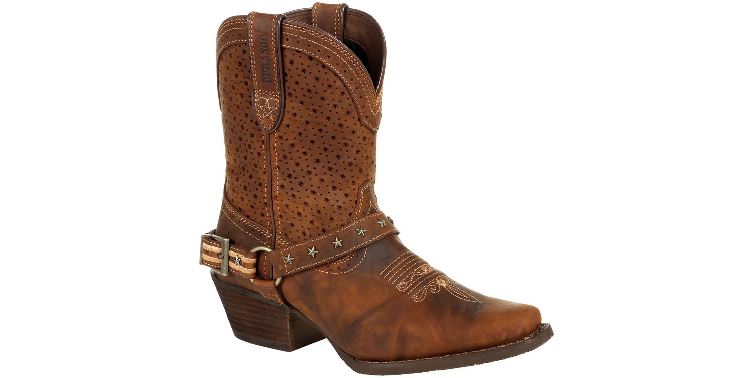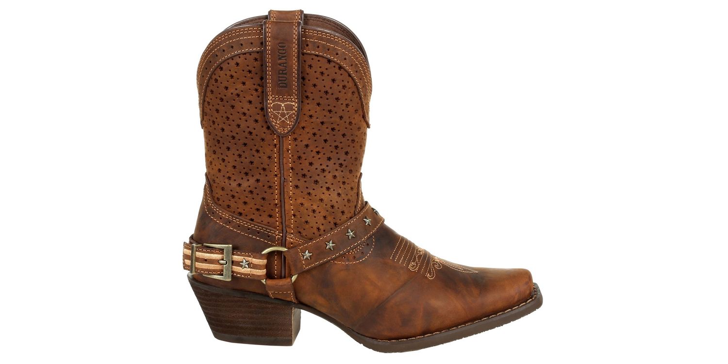 Durango Ladies Crush Ankle Boots offer the perfect blend of rugged durability and feminine style. Crafted from full-grain leather, these shortie boots feature a ventilated shaft for breathability, ensuring comfort all day long. The vintage-finished rubber outsole, snip toe, and antiqued brass hardware add a touch of western charm, making them a stylish and practical choice for any occasion.