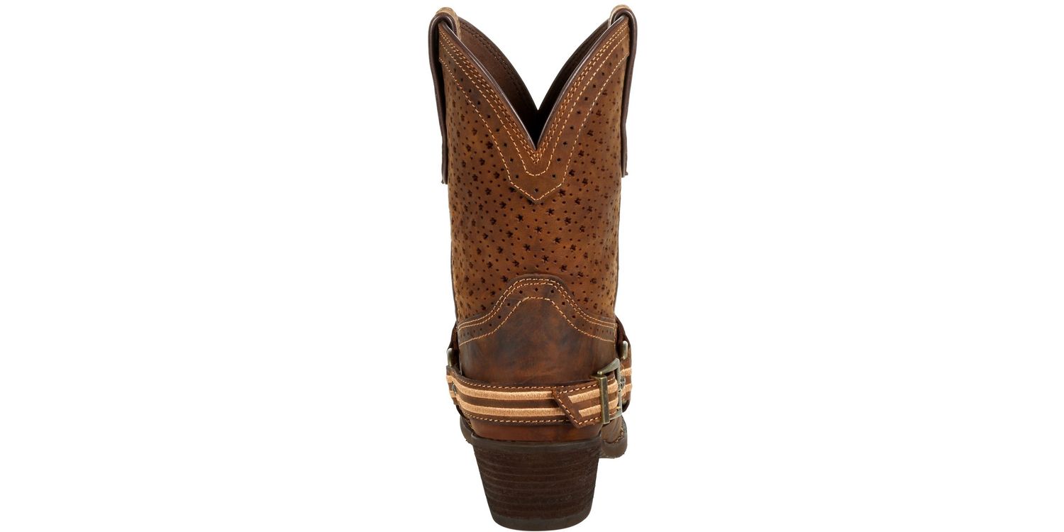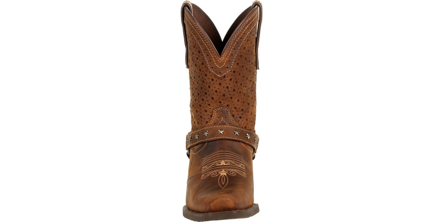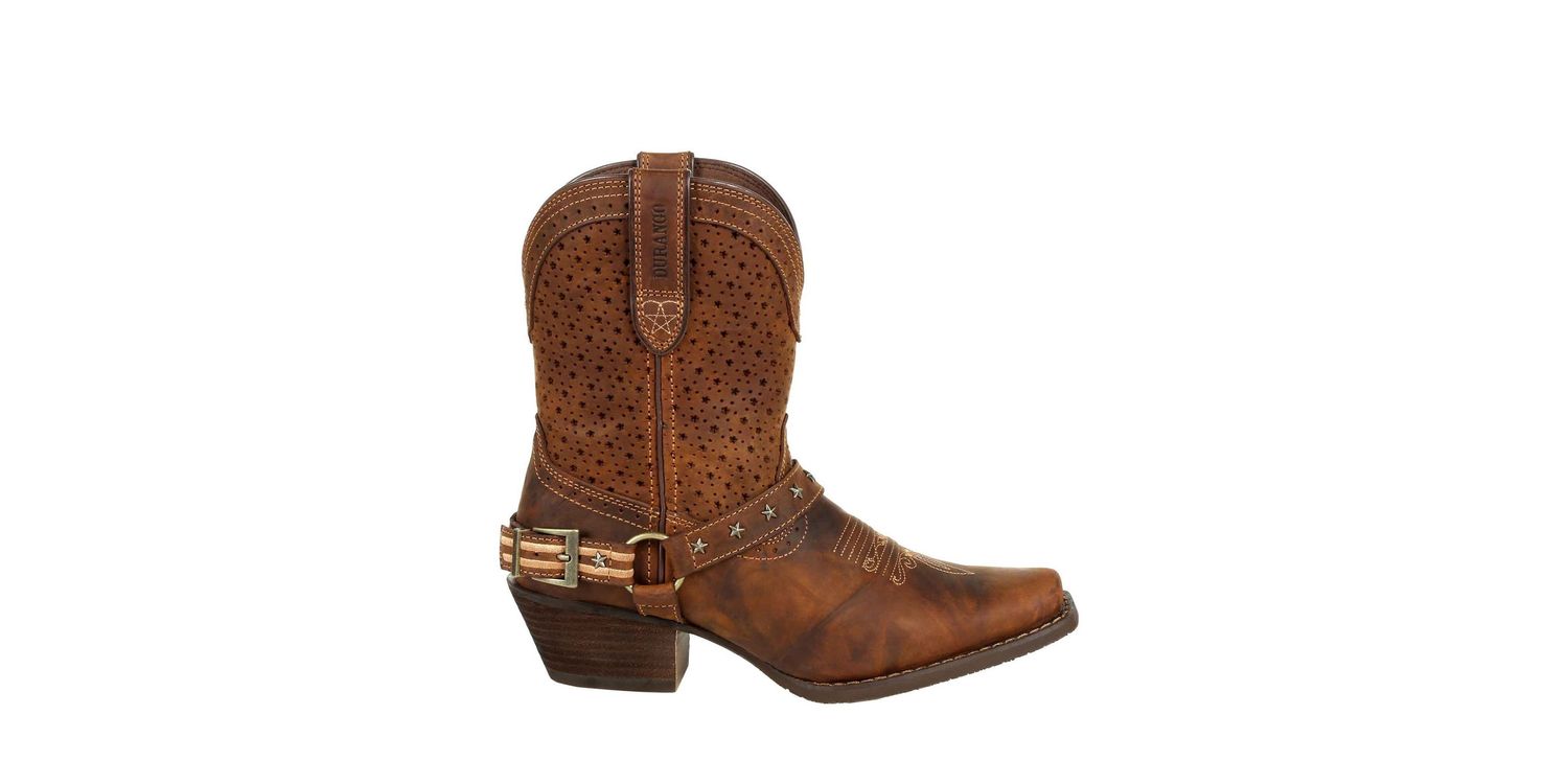Durango Ladies Crush Ankle Boots offer the perfect blend of rugged durability and feminine style. Crafted from full-grain leather, these shortie boots feature a ventilated shaft for breathability, ensuring comfort all day long. The vintage-finished rubber outsole, snip toe, and antiqued brass hardware add a touch of western charm, making them a stylish and practical choice for any occasion.