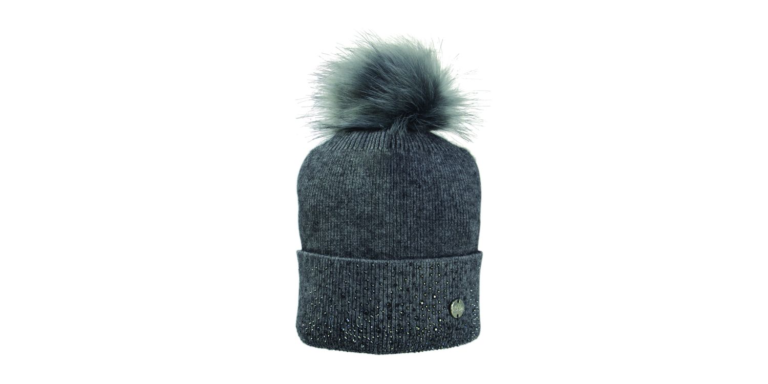 This luxurious close knit bobble hat is beautifully finished with a banded cluster of delicate diamantes across the front of the hat. The faux fur bobble is easy removed for washing as it has a press stud securing it in place. Keep warm and add a touch of sparkle to your outfit with this on trend hat.