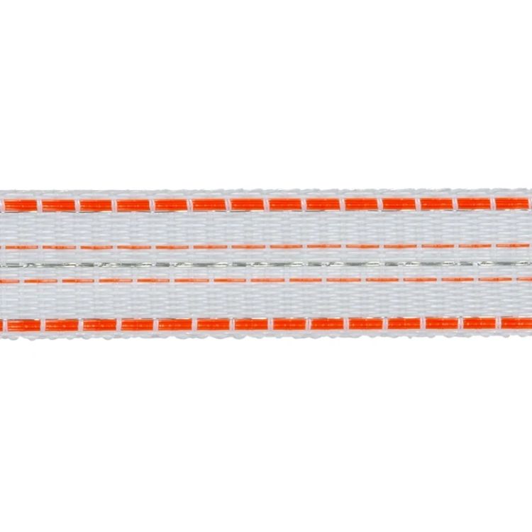 With a low resistance of 0.09 Ω/m, this tape conducts far better than standard 20mm tape. This is due to two tinned copper wires of 0.25mm located in the centre of the tape. This is important because it ensures the entire electric fence is well powered, even over long distances of more than 500 metres. Additionally, there are two stainless steel wires of 0.16mm and one of 0.20mm, evenly distributed across the width.