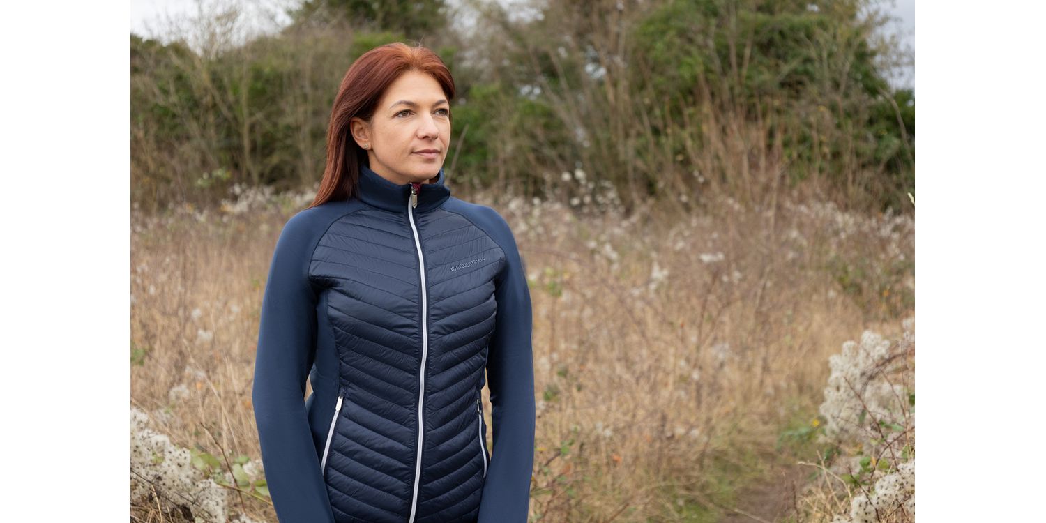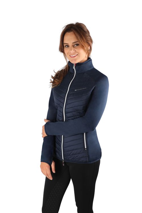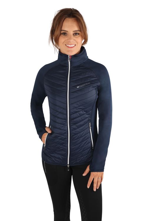 This versatile jacket is the perfect item to wear as a layer when required. It features a chevron quilted front and back with soft, fleece lined jersey material side panels that have a contoured shape to offer a flattering fit and look when worn. The fashionable and practical silver two way zip features an engraved Hy Equestrian emblem for that special finishing touch. With matching silver Hy Equestrian logo on the chest and to the back collar, practical zipped pockets for possessions and snug thumb hole cuffs. Matches the Synergy collection.